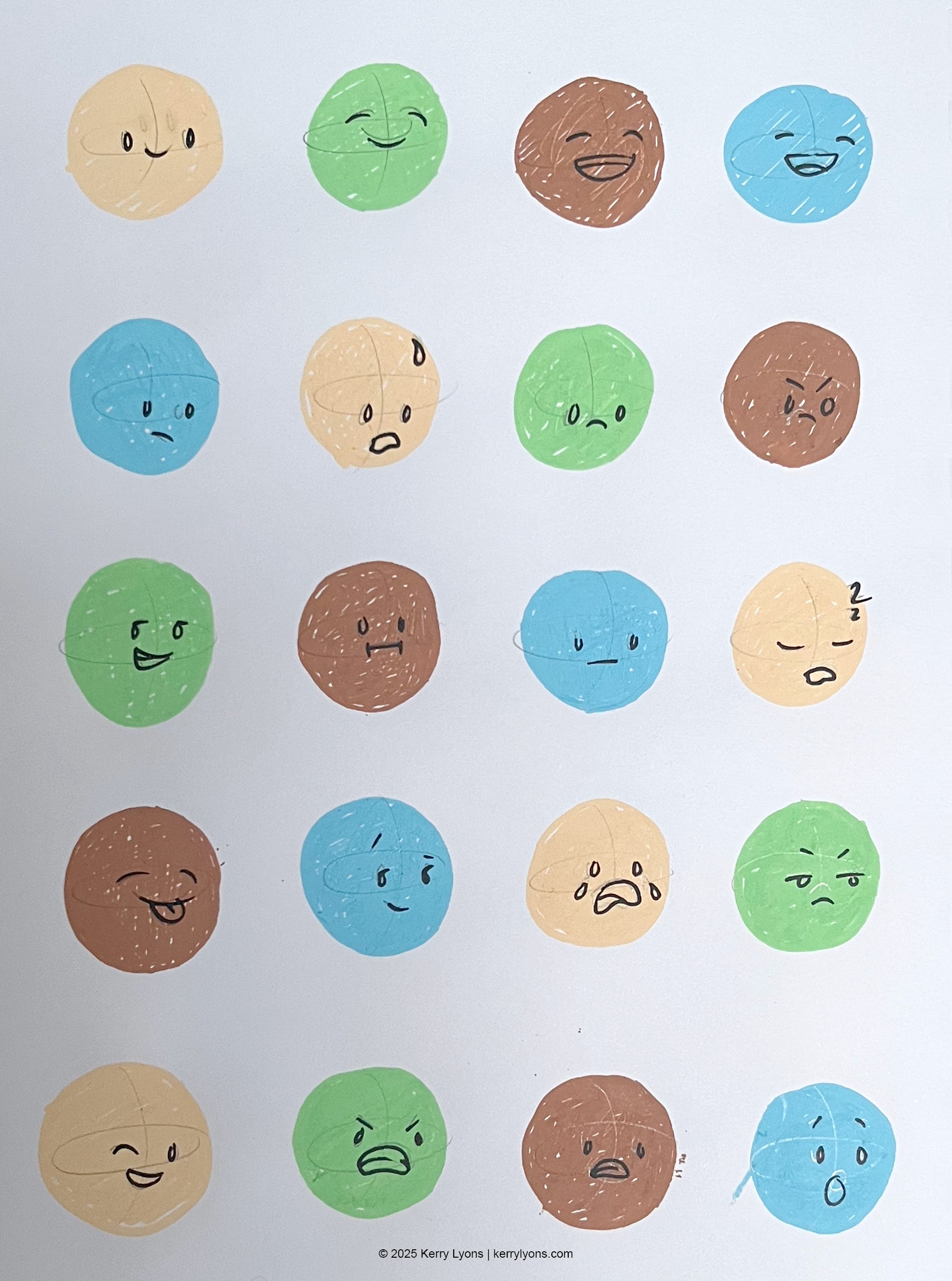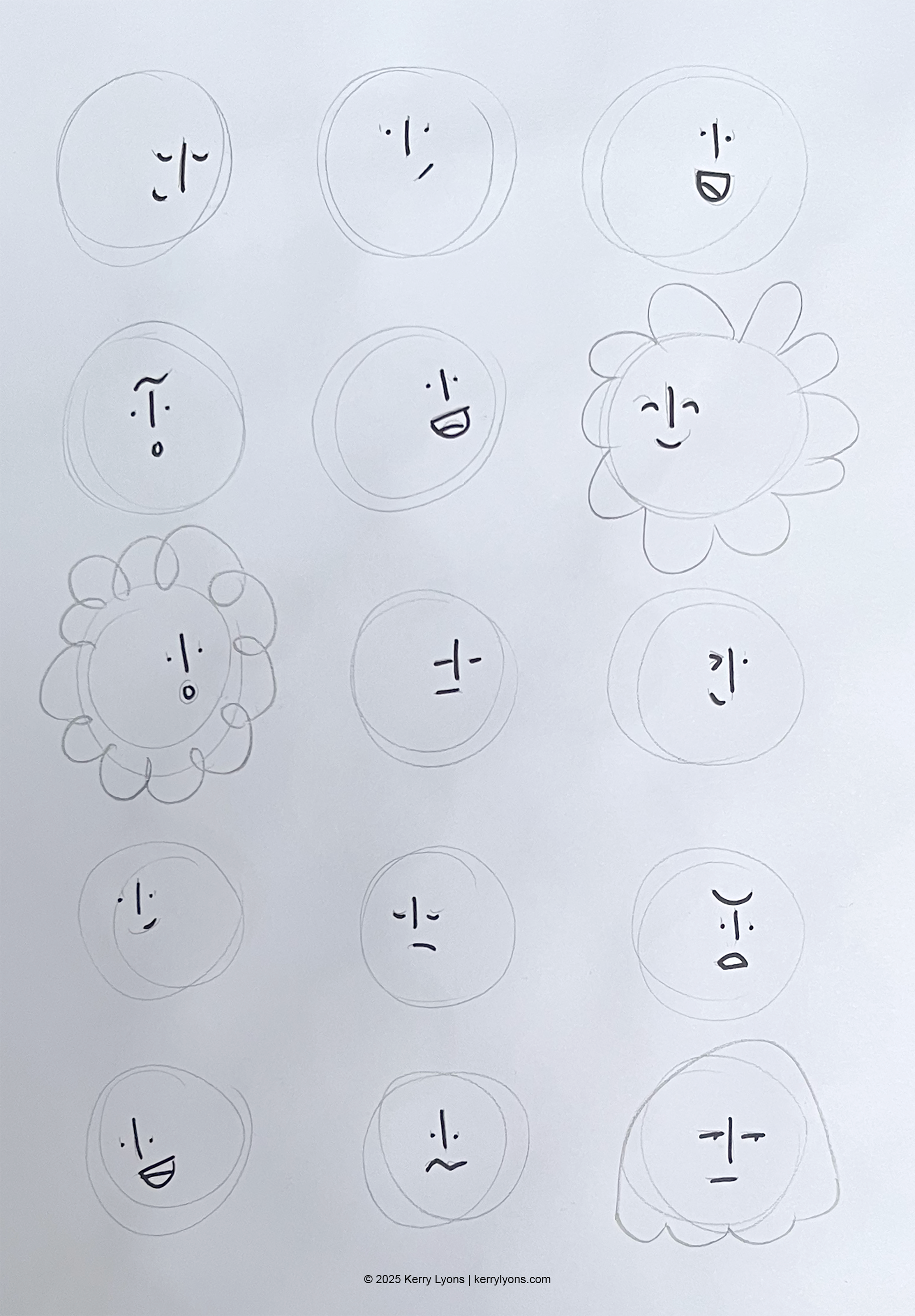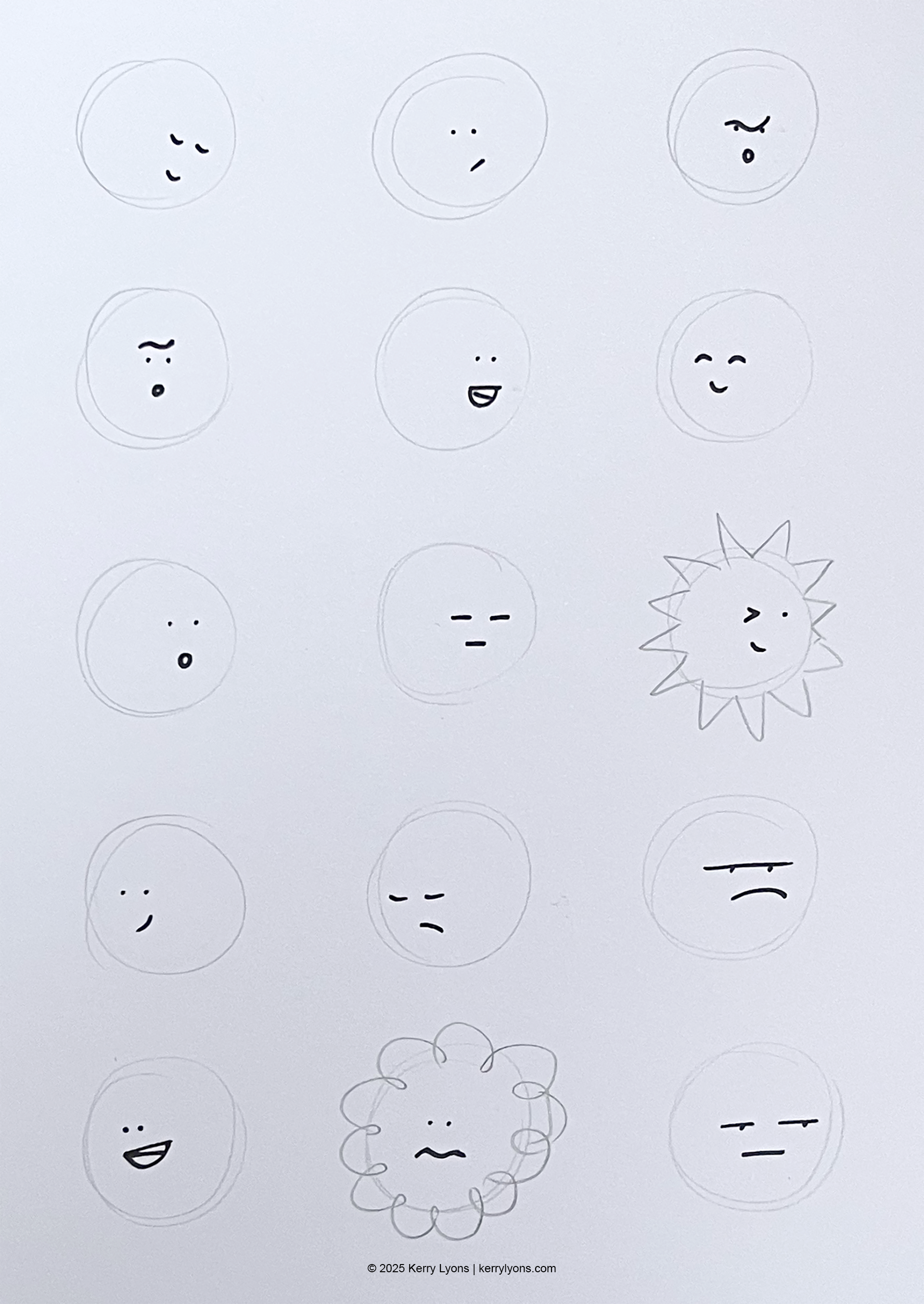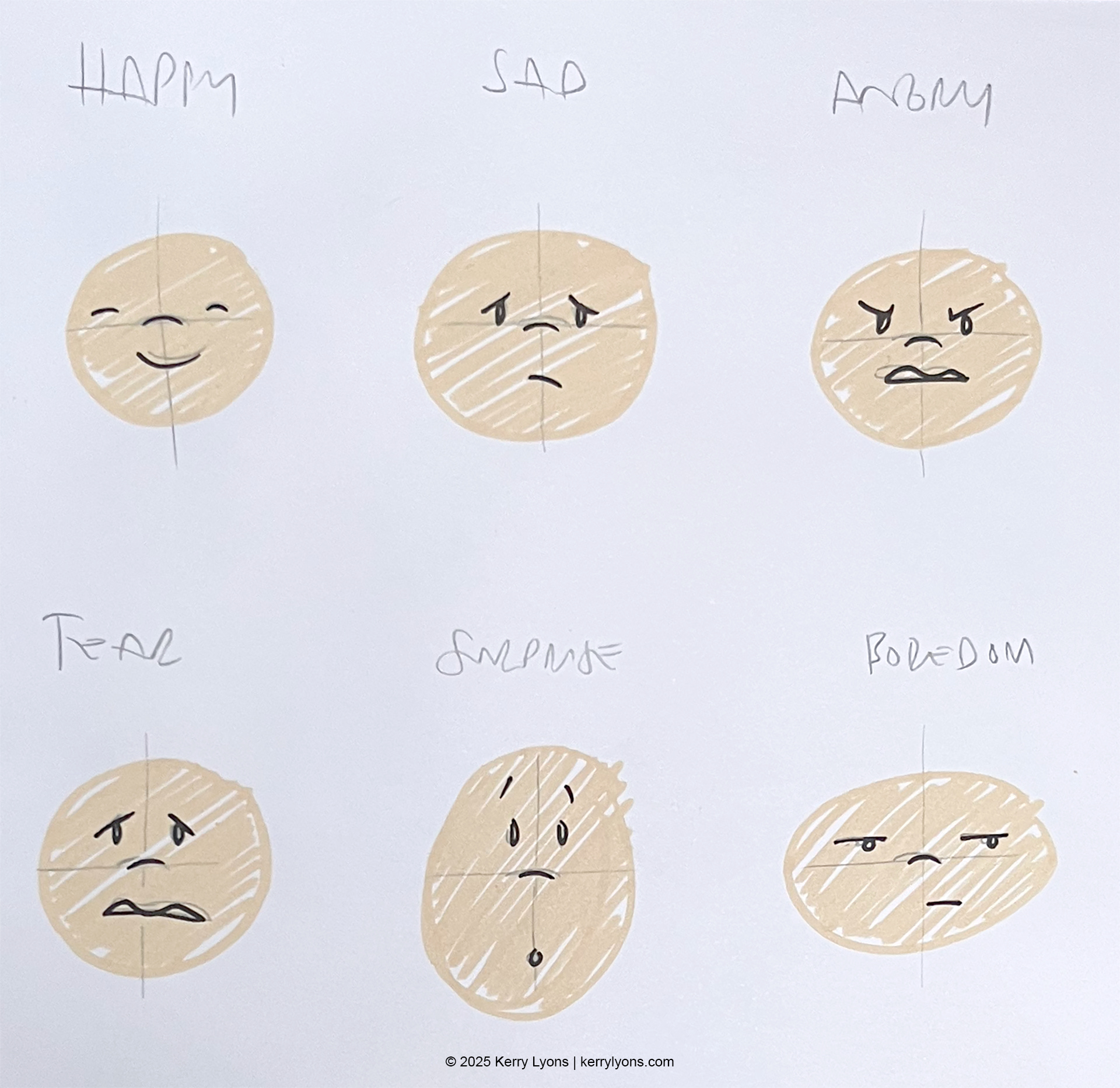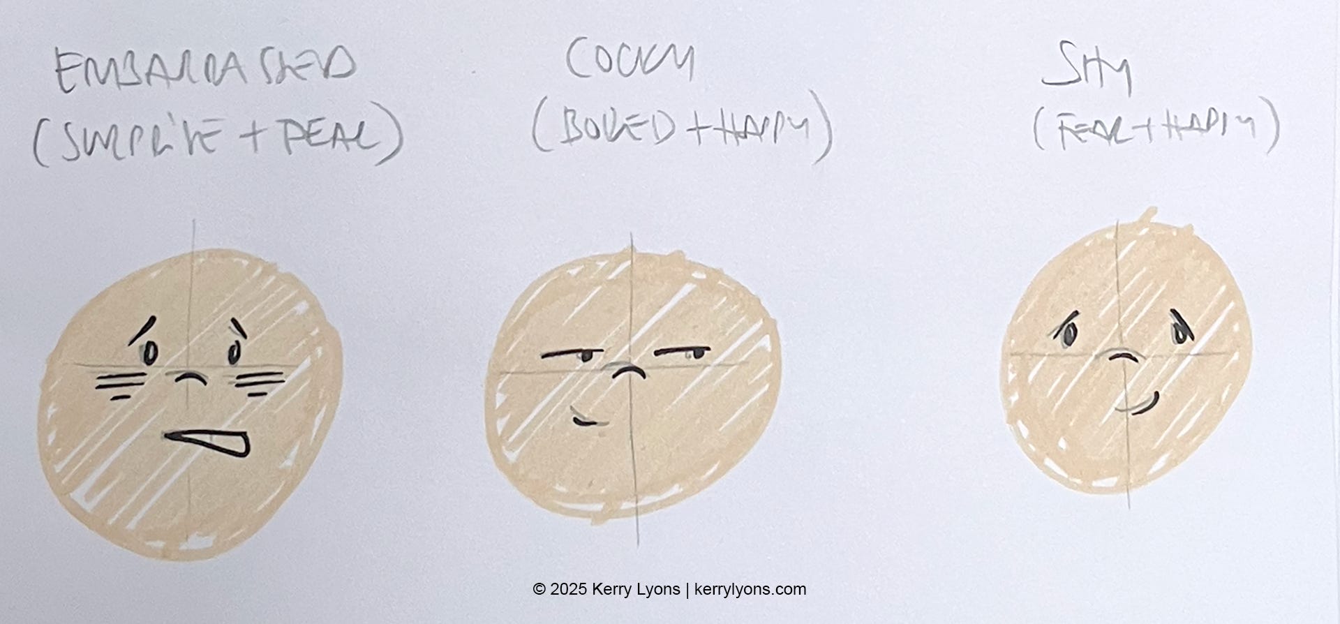 Of course, the obvious are ‘happy’ and ‘sad’, and I can of course draw those two. But ‘embarrassed’? ‘Cocky’? ‘Shy’?